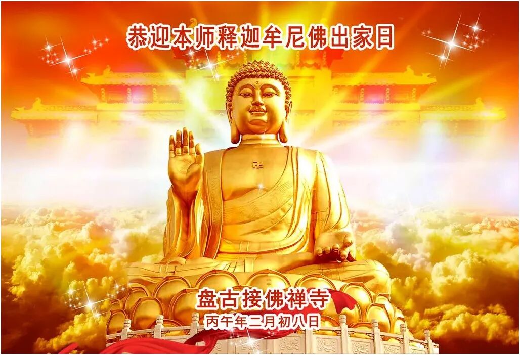 2026年3月26日,农历丙午年二月初八日,星期四。恭迎本师释迦牟尼佛出家吉日。值此因缘殊胜之际,盘古接佛禅寺将在当日举行吉祥法会:称念佛陀名号,上供、礼拜金刚宝忏,诵念《金刚经》等。福慧同修、共证佛道。